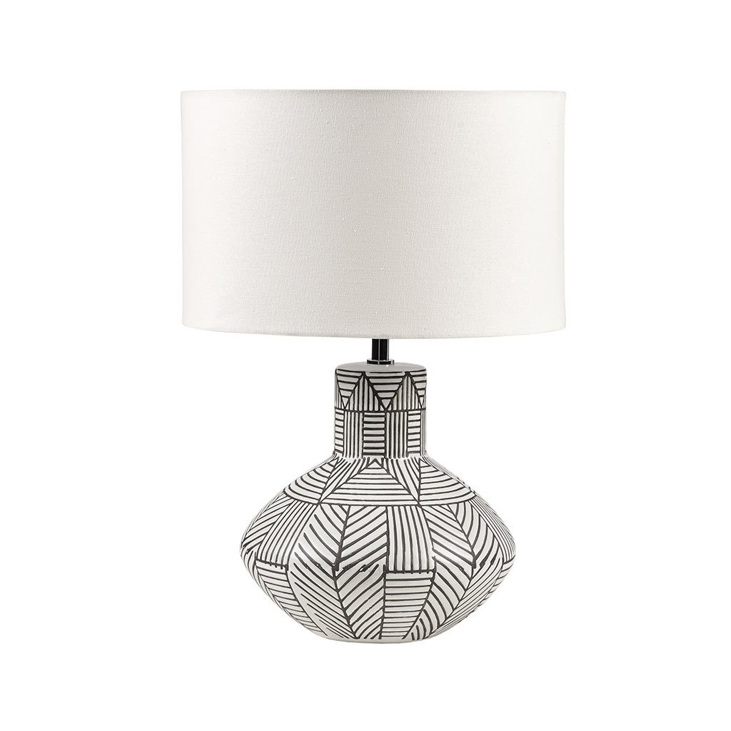 Description:DescriptionMake a statement with the modern style of the INK+IVY Agape Boho Ceramic Table Lamp. This round table lamp features a gourd-inspired base flaunts a geometric stripe pattern against the white finish to create a bold contrasting design. A round drum lamp shade acts as a soft light filter to create a warm ambiance, while also complementing the contemporary aesthetic. Perfect for illuminating your living room, this ceramic table lamp provides a sophisticated update to your home. Handle with care. Spot clean only.Product DetailsSee below1 Table Lamp:13.78"Dia x 19.88"HBody Size:10.24"Dia x 10.24"HShade Size:13.78"Dia x 8.27"HSocket Size:1.5"Dia x 2.5"HCord Length:60"Material75% Ceramic, 20% Fabric, 5% IronBase: Ceramic Shade Fabric: 50% linen, 50% polyester